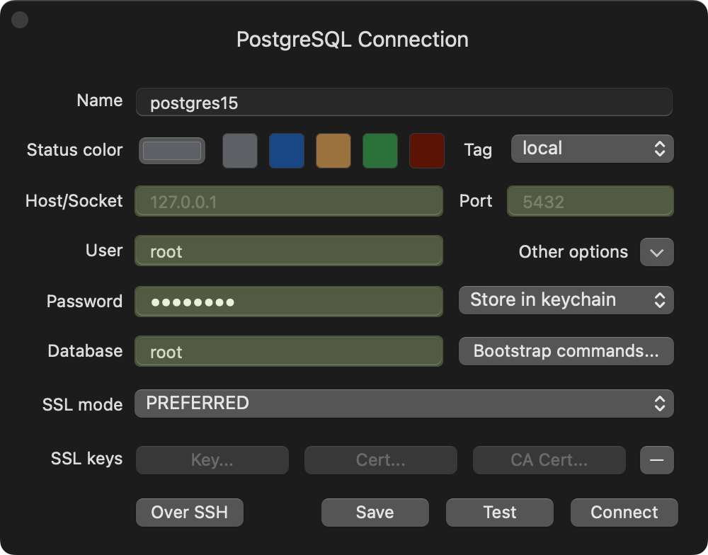 brew install tableplusConnect to Postgres with the setting