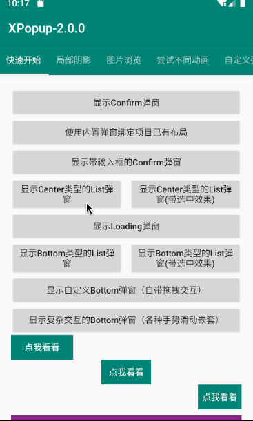 • 功能强大,内部封装了常用的弹窗,内置十几种良好的动画,将弹窗和动画的自定义设计的极其简单;目前还没有出现XPopup实现不了的弹窗效果。 内置弹窗允许你使用项目已有的布局,同时还能用上XPopup提供的动画,交互和逻辑封装。