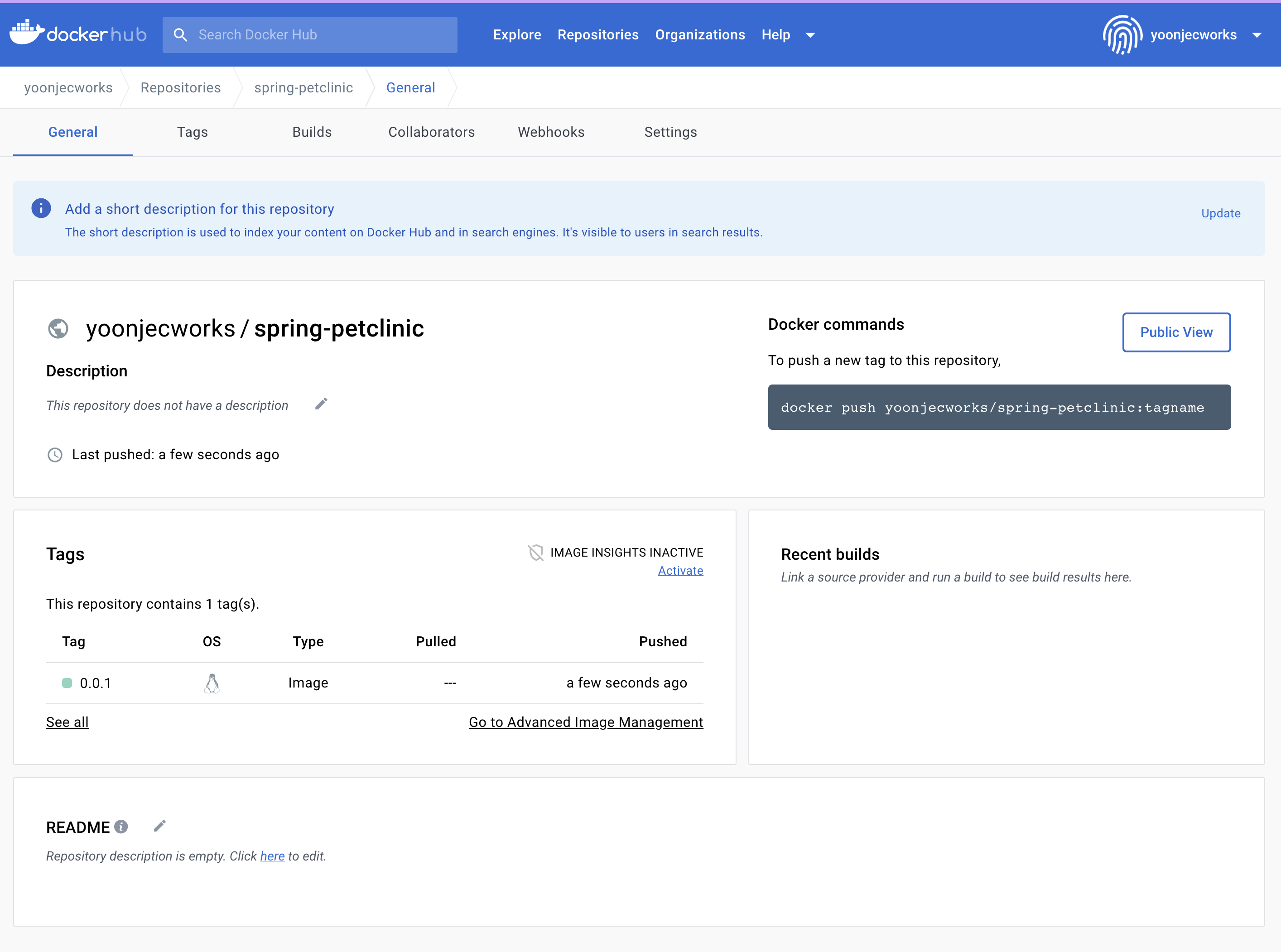 nginx latest 114aa6a9f203 8 days ago 135MB[ec2-user@ip-xxx-xxx-xxx-xxx ~]$ docker run -p 1234:8080 spring-petclinic:0.0.1[ec2-user@ip-xxx-xxx-xxx-xxx ~]$ docker login[ec2-user@ip-xxx-xxx-xxx-xxx ~]$ docker image tag spring-petclinic:0.0.1 [DockerHub]/spring-petclinic:0.0.1[ec2-user@ip-xxx-xxx-xxx-xxx ~]$ docker push [DockerHub]/spring-petclinic:0.0.1