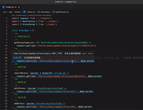 Yapi To Code 对文档中未定义参数类型或返回值类型的接口进行波浪形警告,可以通过快速修复(quick fix)直接添加接口类型到项目中。