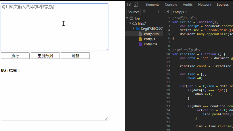 使用方法介绍 Js文件放在code文件夹内 修改页面的entry.js文件的第4行,选择要调试的js代码 第一个的框写测试数据 “执行”按钮:执行数据 “重新测试”按钮:(不刷新页面的情况下)重新测试数据,点完后需再点一下“执行” “刷新”按钮:刷新页面 结果会在第二个的输出框打印出来 调试的功能当然还是由chrome的开发者工具来实现 注意 程序超级简陋,只为实现基础功能。 填测试数据的时候,一开始不要打回车或者空格什么的,顶格写数据 。因为没写过滤的函数,实在抱歉,后面有时间再完善吧。 如果想用es6的语法,建议将代码调试的时候讲代码用大括号括起来“{}”,不然“重新测试”的按钮用不了,因为其变量不能重复定义的关系。 readline()和print()的使用和牛客提供的一样: entry.js文件是整个项目的核心,代码很简单,可以自己进行更改
